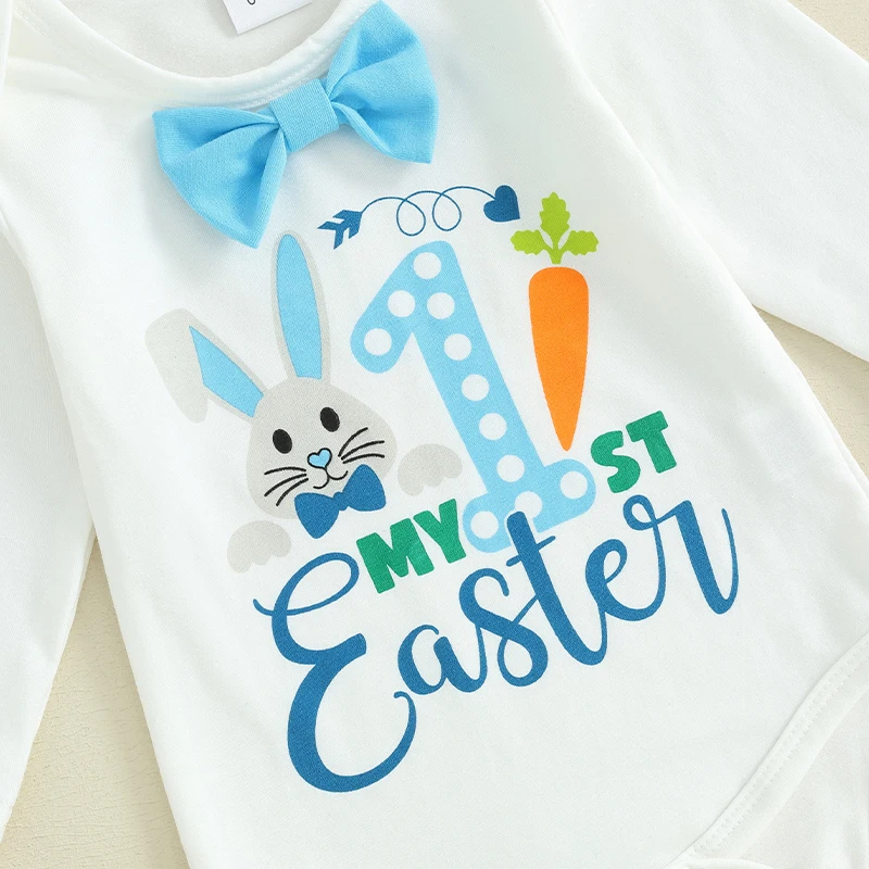 Infant Toddler Boy Set, Round Neck Long Sleeve Rabbit Print Romper + Elastic Waist Suspender Pants + Cute Hat Easter Outfits